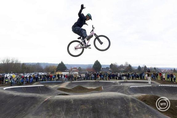 Az átadás után, Nagy Oszkár bemutatót is tartott a Békés vármegyei, gyulai származású Kempf Zozó és Zöld Gergő kerékpárosokkal a zsámbéki pumpapályán, majd a helyi fiatalok vették birtokba az ugratókat. (Forrás: MTI)