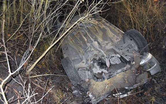 Kép2: Sarkadkeresztúr külterületén, az autó vezetője jobbra ívelő kanyarban veszítette el az uralmát a kocsija felett, majd a bal oldalon letért az útról és az árokban felborult. Kép forrása: Békés vármegyei rendőrség Facebook-oldala