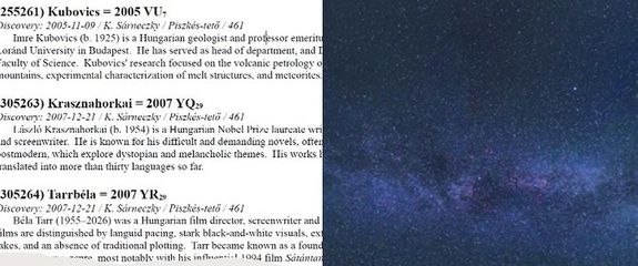 A névötleteket Sárneczky Krisztián, az ELKH Csillagászati és Földtudományi Kutatóközpont Piszkéstetői Obszervatóriumának tudományos munkatársa nyújtotta be, aki számos kisbolygót és több szupernóvát is felfedezett már. Sárneczky Krisztián 2005 és 2007 között azonosította a most elnevezett kisbolygókat, amelyek eddig csak ideiglenes számjelzéssel szerepeltek a nemzetközi nyilvántartásban. A kisbolygók a csillagász javaslatára most nyerték el végleges nevüket. (Forrás: MTI)