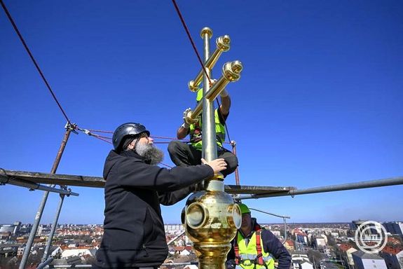 Kép1-3: Debrecenben, 2026. március 6-án, visszahelyezték a felújított keresztet az új időkapszulával a görögkatolikus főszékesegyház tornyán. A keresztet Kocsis Fülöp érsek-metropolita áldotta meg. Képek: MTI / Czeglédi Zsolt