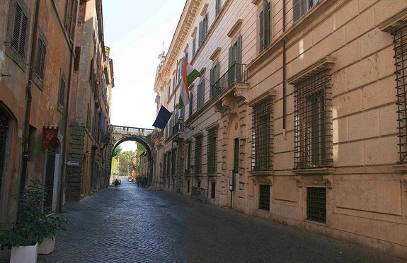 Kép1: A Pápai Magyar Intézet a felszentelt papok továbbképzésének kollégiuma, Rómában működik 1940 óta, a Falconieri-palota (jobbra) emeletén. Forrás és kép: Wikipédia
